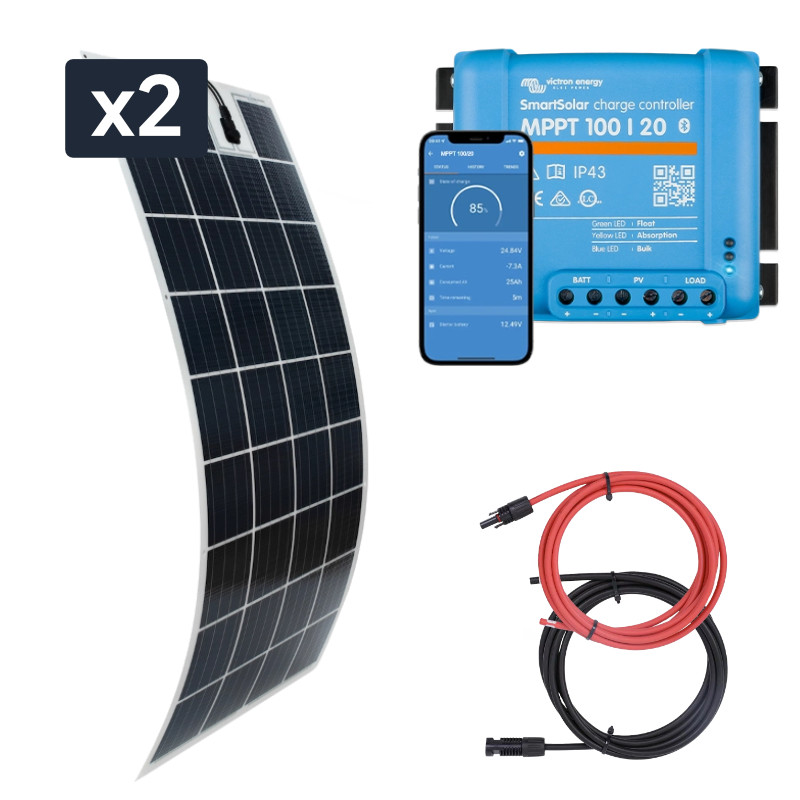 Zestaw zawiera dwa panele słoneczne elastyczne, regulator MPPT zarządzany przez telefon oraz okablowanie. Dedykowany jest do ładowania akumulatorów o pojemności do 200Ah. Może być stosowany na kamperach lub przyczepach kempingowych. Sugerowana opcjonalna moc przetwornicy napięcia 500-1200W